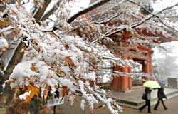 延暦寺では薄っすらと雪化粧し、名残の紅葉に降り積もった雪が何ともいえない味わいを出していたとか。
